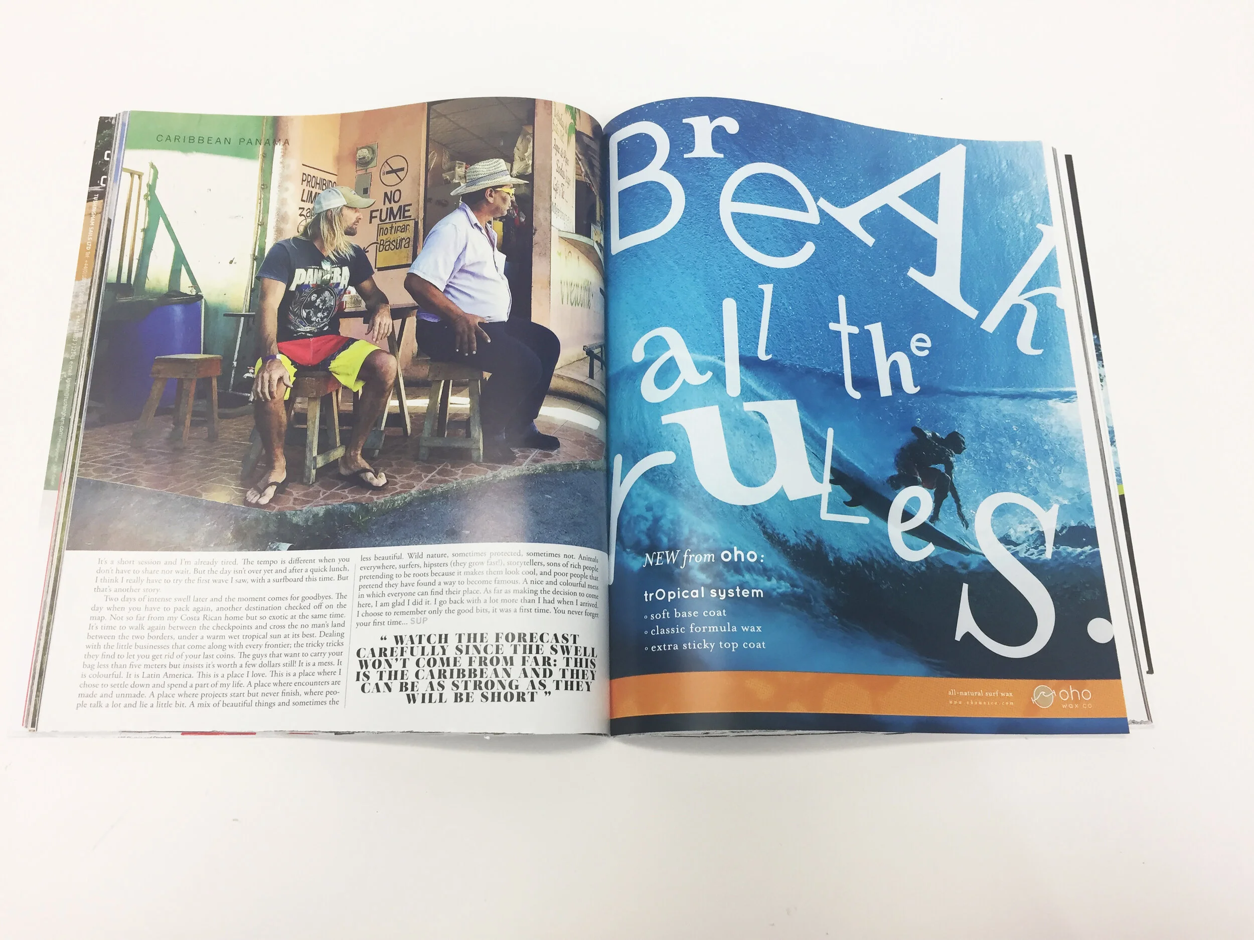 The prompt for this assignment was to create a brand, product, packaging, and ad series based on the word oho. Oho is an exclamatory word, indicating excitement. As I thought about when one might use this word, I thought about the feeling of dropping into a wave, of my stomach dropping and an involuntary “Oho!” spilling out of my mouth. I decided to create a surf wax brand that embodies this sensation.