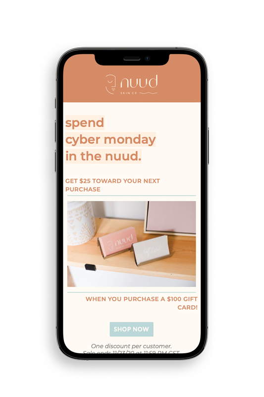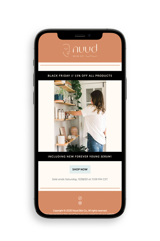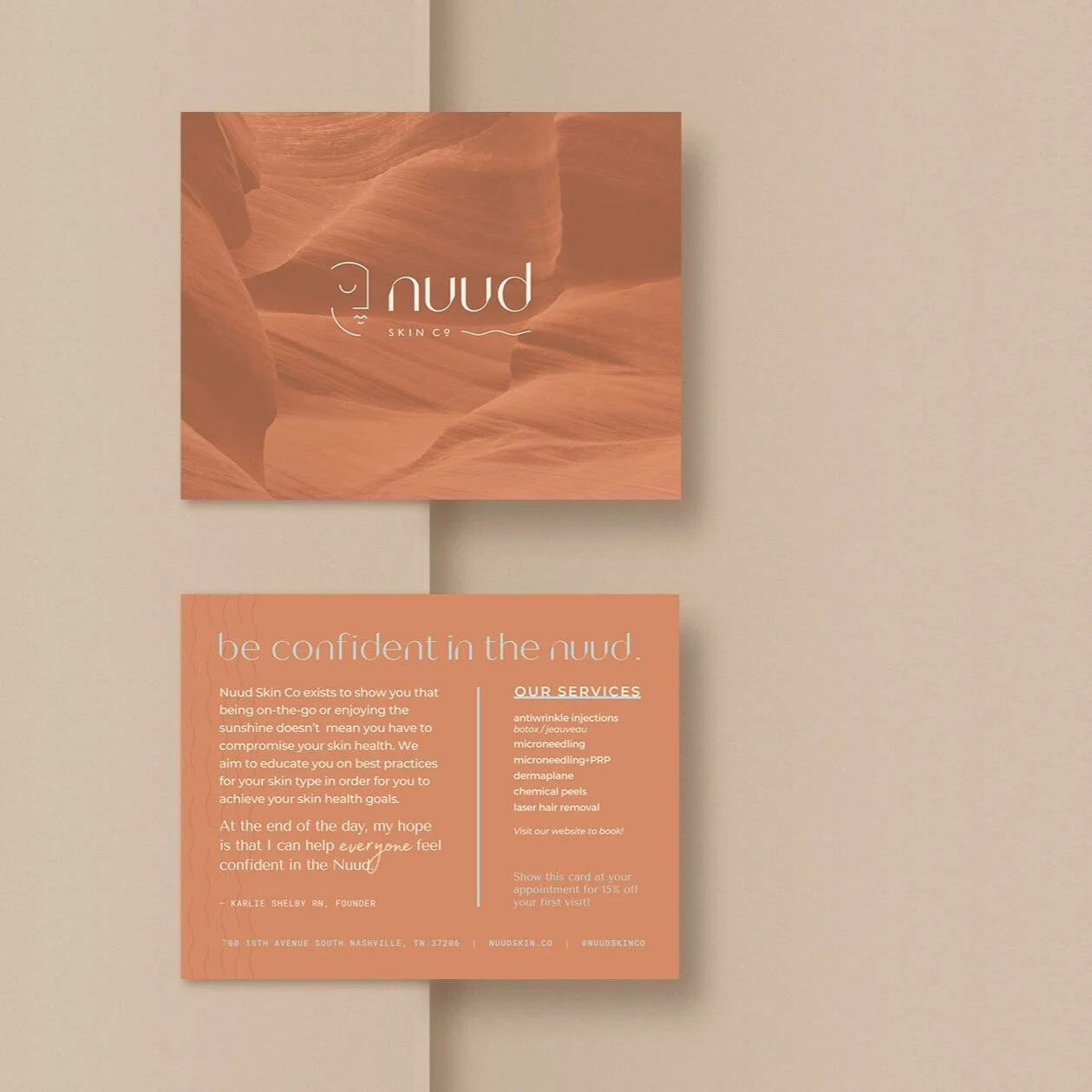 A brand is never “just a logo.” In fact, the logo is a small part of a well-developed brand. Before creating a visual identity, Karlie and I worked together to nail down her brand strategy. We talked through her unwavering brand values, who her client is, what she wants that client to believe about themselves and the world after an interaction with Nuud Skin Co, and (most importantly) why she started Nuud Skin Co in the first place. These conversations informed every decision made in creating the Nuud Skin Co brand identity and inform every situation Karlie makes in sharing this brand with the world!